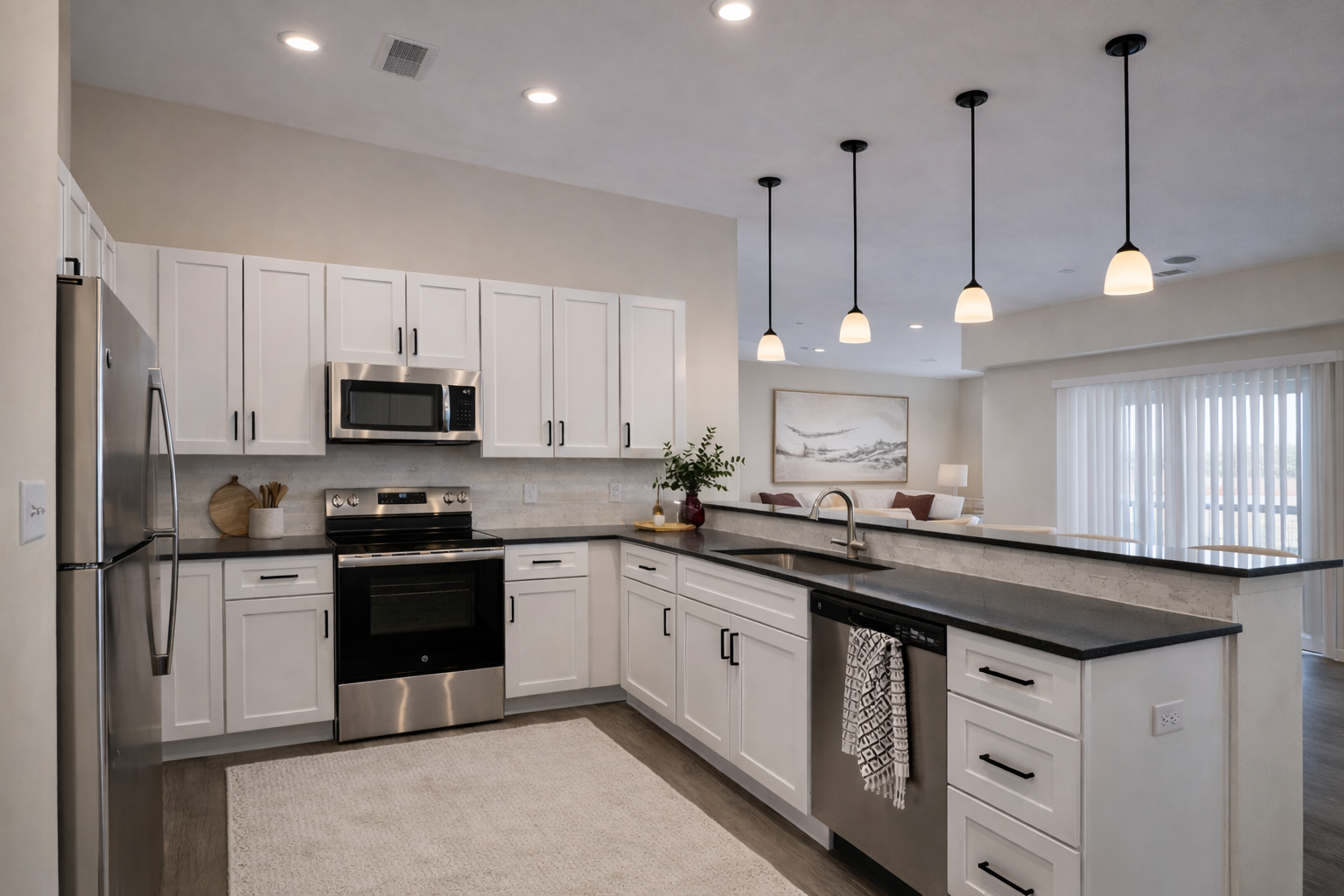 Our newly built, modern apartments feature spacious 1- and 2-bedroom floorplans. Live in style with beautiful tall white cabinetry, granite countertops, and upgraded stainless steel appliances. Enjoy the durability of vinyl plank flooring throughout, along with designer walk-in closets, linen closets, and in-unit washer/dryer hookups. And, each home also includes private entrances, open-concept layouts, and private patios or balconies with beautiful scenic views of the surrounding natural landscape. All the ideal features and amenities for both everyday living and entertaining. Live better!